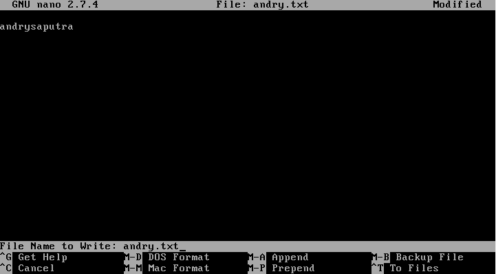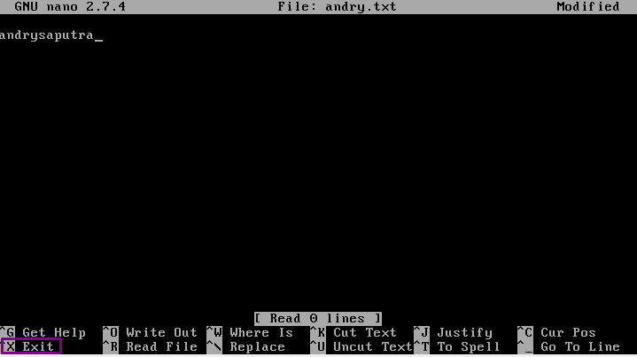 7. Kemudian, “nano” fungsinya adalah membuka teks dengan ukuran lebih kecil dan dapat menambahkan isi note/ kata-kata kedalamnya. Ketik tulisan ( Bebas ) lalu klik ctrl+x untuk menyimpan, setelah itu klik Yes ( beri nama file ) dan Enter.