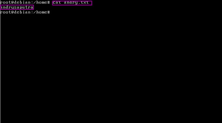 12. “cat” fungsinya adalah melihat isi dari dua file atau menggabungkan dua file. Ketikkan dengan format “cat namafile”.