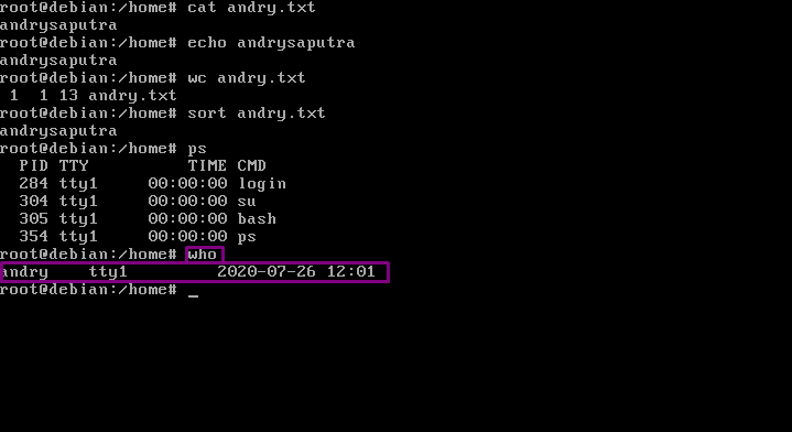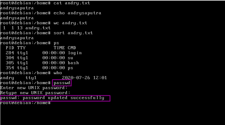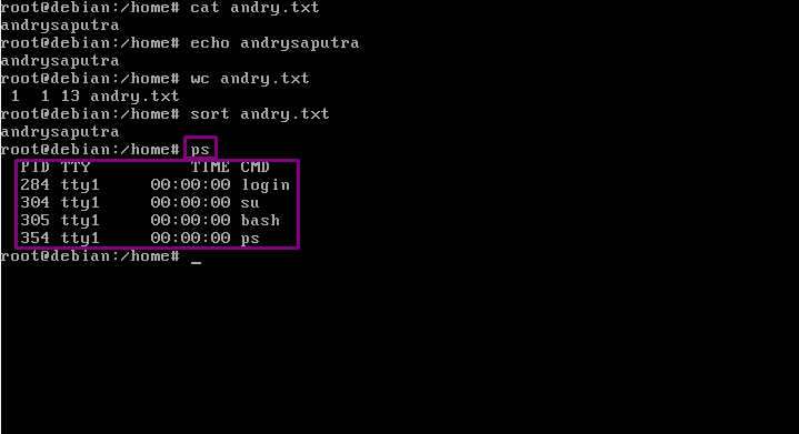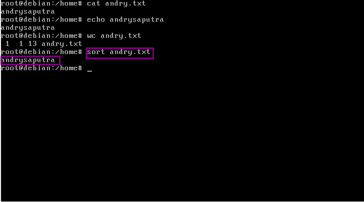 15. “sort” fungsinya adalah Menampilkan isi dari teks yang terdapat pada file. Ketikkan dengan format “sort namafile”.