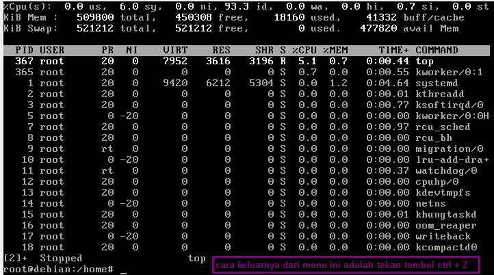 22. “top” fungsinya adalah Menampilkan proses yang sedang berjalan, diurutkan dari yang terbesar hingga terkecil. ( Catatan :untuk keluar dari mode ini cukup klik tombol ctrl+z).