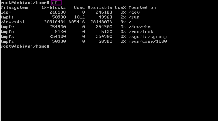 23. oke kita lanjutkan, perintah “df” fungsinya adlah menampilkan ruang disk pada file.