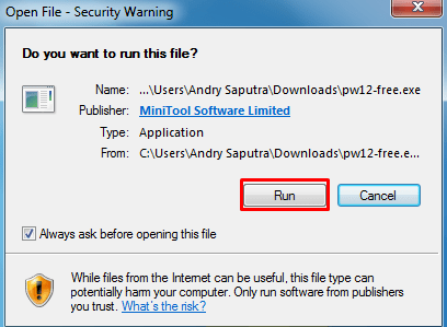 4. Buka file aplikasi minitool yang tadi kita telah download !! kemudian muncul Notifikasi / pesan seperti ini !! kita pilih Run dan Yes.