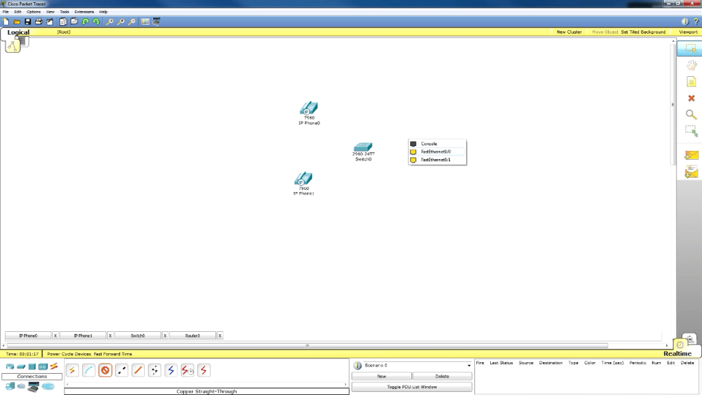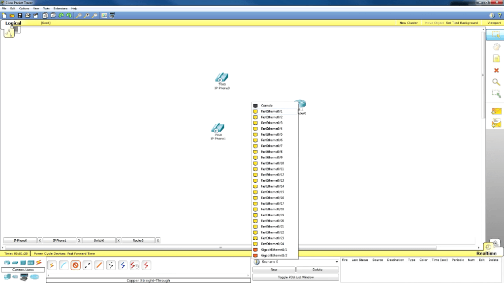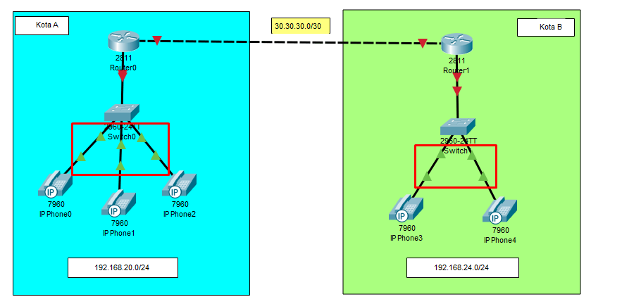 5. Untuk kabel straightnya dari Ip Phone ke Switch ( baik kota A atau B ) saya urutkan misal, ip phone 0 saya sambungkan kabel straight. Kemudian, pilih switch kemudian FastEthernet0/1. Dan ip phone 1 = FastEthernet0/2 dan ip phone 3 = FastEthernet0/3. Dan di kota B ( Ip Phone 4 = Fast Ethernet0/1) dan Ip phone 5 = FastEthernet0/2)