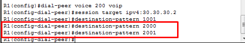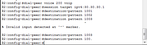 19. Lalu beralih dari Router Kota A, Kita Akan mendaftarkan semua number Ip Phone dari Kota A, Pada Router Kota B. dan Digambar tertera saya mengetik perintah (100.) itu bermaksud jika ada ip phone yang jumlahnya ratusan kita akan kelelahan mendaftarkan ip phone tersebut makanya, saya menggunakan perintah (100.) caranya : device/ip phone saya ada = 1001,1002,1003 untuk cepatnya pakai saja 100. atau bisa juga dengan manual yaitu, destination-pattern 1001 sampai semua device telah terdaftar !!.