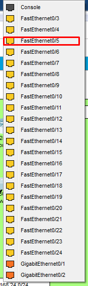 6. Lalu, untuk Switch ( saya menggunakan FastEthernet0/5 ) ke router (Fast Ethernet0/0 ) ( baik switch di kota A ataupun Kota B ) agar memudahkan saya nantinya dalam konfigurasi.