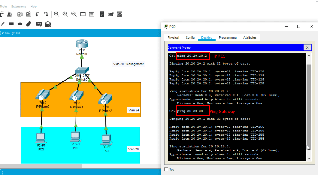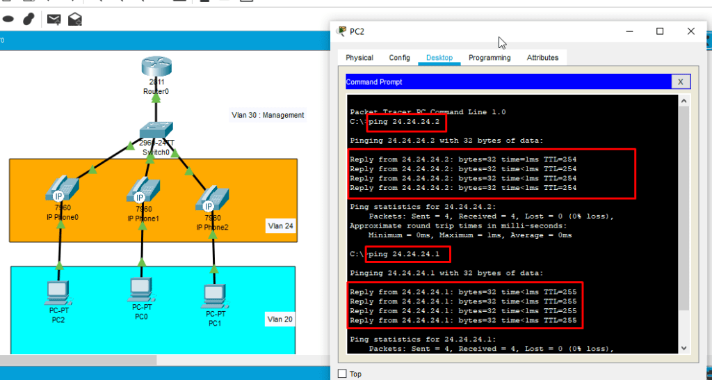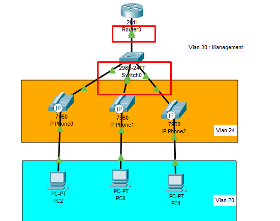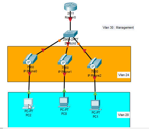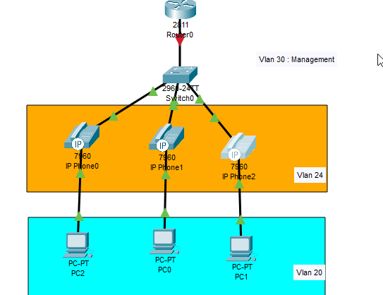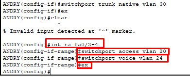 7. kemudian kita masuk ke interface dari port yang mengarah ke IP Phone dan PC. Yaitu fa0/2,fa0/3,fa/04 karena interface berurutan maka kita gunakan fitur Range. dengan perintah interface range fa0/2-4. kemudian untuk interface port ini pertama kita jadikan akses ke vlan PC yaitu vlan 20, dan jadikan port voice pada IP Phone yaitu vlan 24.