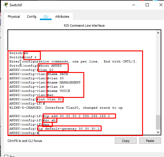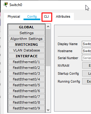 5. setelah sudah, tap perangkat switch pada media kerja/topologi kemudian akan muncul gambar seperti dibawah ini ! lakukan konfigurasi yang tertera pada gambar dibawah ini !