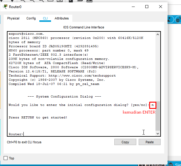 8. Selepas itu, kita akan melakukan konfigurasi pada router. pindah yukk!! ke router yaa jangan mendep di Switch !. Tap Perangkat Router pada Media Kerja.topologi kemudian pindah ke Tab CLI. lakukan Konfigurasi Seperti Dibawah Ini :