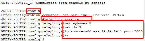 11. selanjutnya, kita akan melakukan konfigurasi VoIP dengan perintah telephony-service. lihat gambar dibawah ini : ( perintah max ephone maksudnya memberikan jumlah maksimal perangkat ip phone yang akan diikutkan untuk dikonfigurasi. karena di topologi kita hanya memiliki 3 IP Phone maka beri angka 3 setelahnya ).