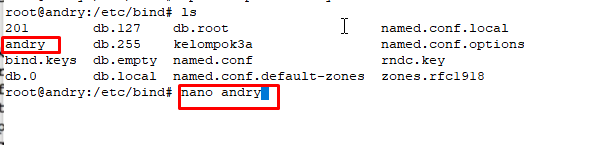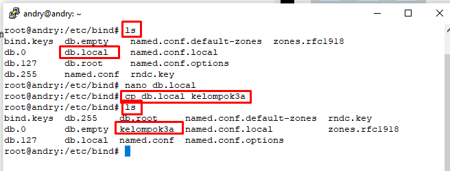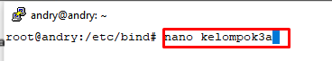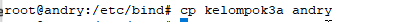 2. Setelah itu kita copy kembali file db.local/kelompok3a yang sebelumnya bekas copy-an milik db.local ( prinsipnya sama ) untuk membuat domain 2, masukkan perintah cp kelompok3a andry. andry yaitu nama domain 2 yang telah kita daftarkan sebelumnya. perintah ls untuk melihat berbagai isi file.