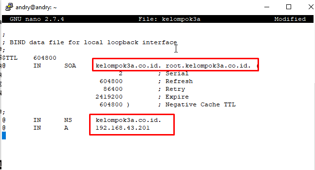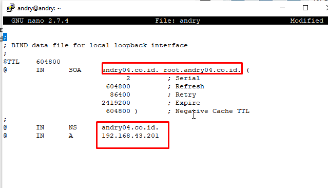 Selanjutnya kita ubah localhost menjadi nama domain 2 yang akan kita gunakan, lalu masukkan IP Server. Untuk domain 2 saya menggunakan domain name andry.co.id dengan IP Server 192.168.43.201 sama seperti yang telah didaftarkan.