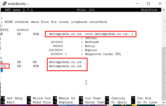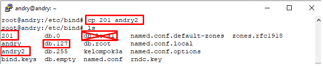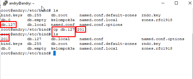 4. Setelah itu copy kembali file db.127 atau nama file yang sama dan telah dikonfigurasi untuk kelompok3a.co.id untuk mencadangkan isi file, masukkan perintah cp 201 andry2. untuk membuat lokasi penyimpanan pada domain 2. Gunakan nama file penyimpanan sesuai yang tadi telah didaftarkan, disini saya menggunakan andry2.