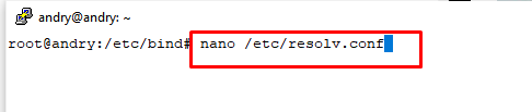 6. Selanjutnya kita masuk ke cd /etc/resolv.conf untuk menambahkan kedua domain yang tadi telah kita buat agar dapat bisa melakukan ping pada domain.