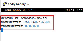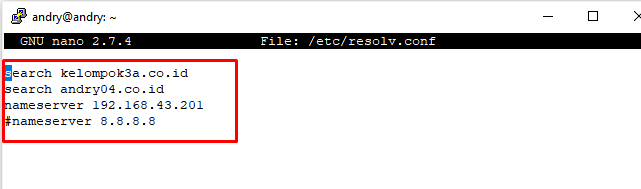 Searchandry04.co.id : nama domain, 2 .Nameserver 192.168.43.201 adalah IP Address yang digunakan Nameserver 8.8.8.8 : agar dapat melakukan ping