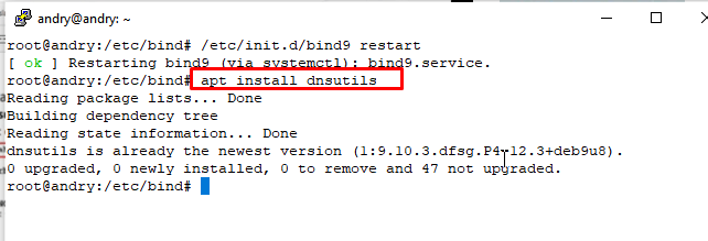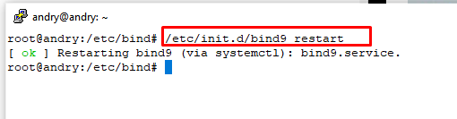 7. Lakukan restart pada bind9 dengan perintah /etc/init.d/bind9 restart.