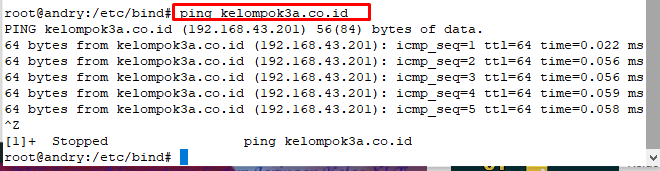 9. Perintahnya :zone “Kelompok3.co.id”{type master;file “/etc/bind/kelompok3a”;