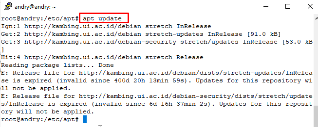 5. Masukkan perintah apt-get update untuk mengupdate repository yang telah kita ubah menjadi link repository lokal kambing.ui.