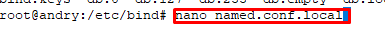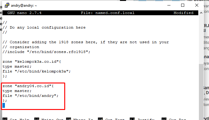 8. Selanjutnya kita masuk ke file named.conf.local untuk memberikan nama domain yang akan kita buat, masukkan perintah nano named.conf.local. Untuk nama domain dan lokasi penyimpanan file dapat menggunakan nama bebas sesuai keinginan masing-masing.