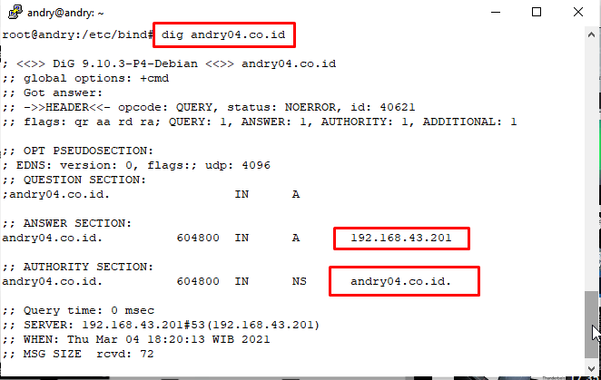 - Pengujian pertama dengan melakukan dig, masukan perintah dig andry04.co.id