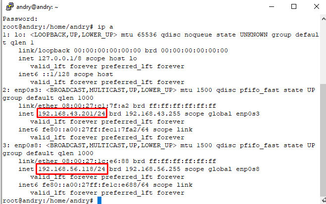 2. Kemudian cek IP Address untuk memastikan IP berapa yang terhubung ke dalam internet, masukkan dengan perintah ip a. Bisa dilihat disini IP Address yang terhubung ke internet adalah enp0s3 dengan IP Address 192.168.43.201.