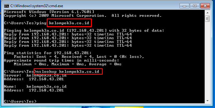 - Ping IP domain dengan perintah ping dan nslookup Kelompok3.co.id