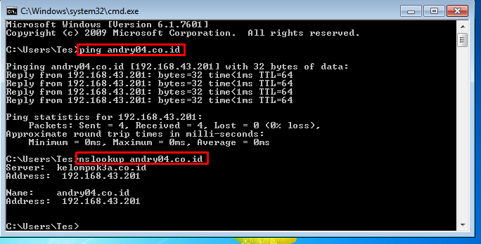 - Ping dan Nslookup, masukkan perintah ping andry04.co.id dan nslookup andry04.co.id