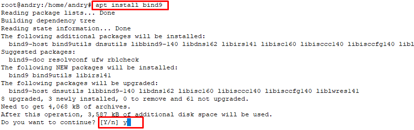 6. Kemudian Install paket DNS Server yaitu bind9 dengan perintah apt-get install bind9, apabila muncul pertanyaan “do you want to continue?” maka kita pilih y.