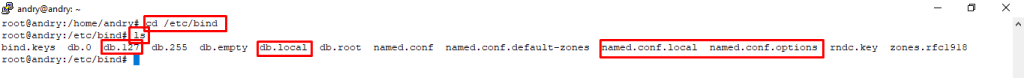 7. Pindah ke direktori bind dengan perintah cd /etc/bind lalu ls untuk melihat file yang ada didalamnya. File yang nanti akan kita gunakan adalah db.127, db local, named.conf.local dan named.conf.options.