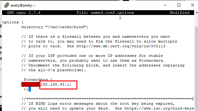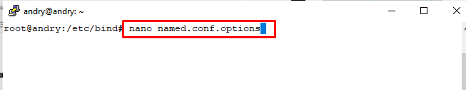 10. Setelah itu masukkan perintah nano named.conf.options untuk memberikan IP Address yang akan diubah menjadi domain.