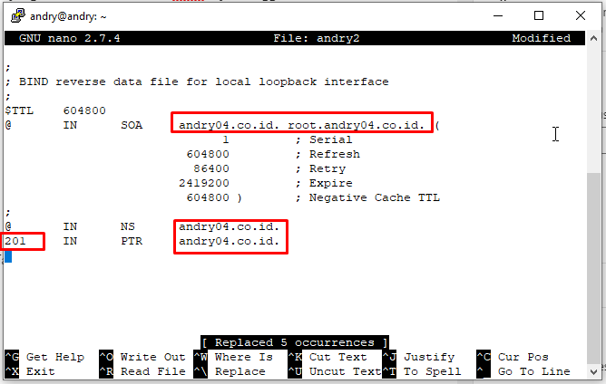 Ubah nama localhost serta IP Server menjadi nama domain 2 yaitu andry04.co.id dengan IP Server 201.