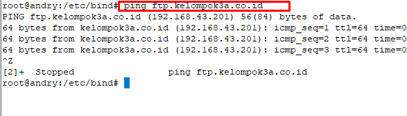 2. kemudian kita ping ftp.(namadomainkamu).(domain akhiran etentik) misalnya disini, ftp.kelompok3a.co.id