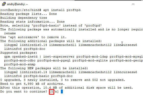 5. Untuk melakukan konfigurasi ftp, kita harus install paket ftp/proftpd terlebih dahulu. dengan perintah apt install proftpd