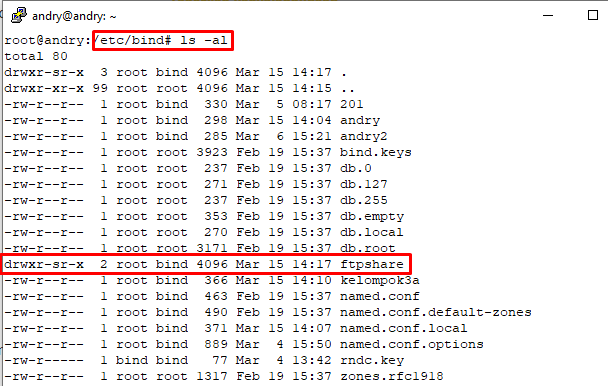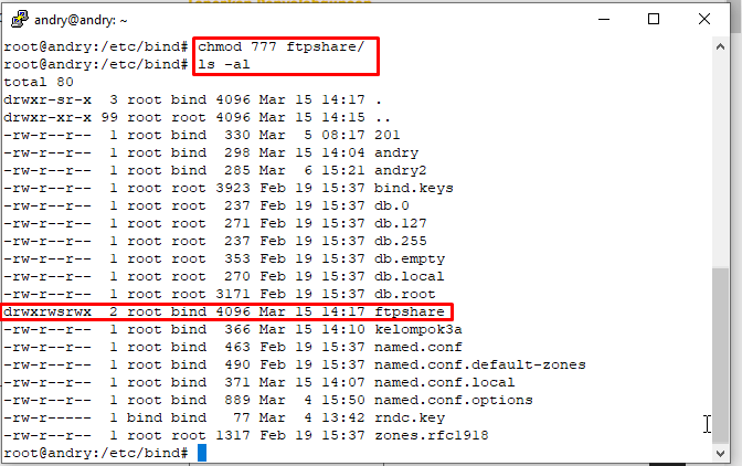 7. Selanjutnya ubah kepemilikan folder yang sudah kita buat agar bisa diakses dan juga diakselerasi/diedit. Dengan perintah ls -al dilanjutkan dengan perintah chmod 777 ftpshare/