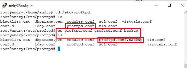 8. Dan bila sudah pindah ke direktori proftpd. Dengan Perintah cd /etc/proftpd dilanjutkan dengan mencopy file proftpd.conf agar ketika konfigurasi ftp dapat dibackup nantinya, 1 error dapat menggunakan 1 lagi dengan versi backup. Perintahnya : cp proftpd.conf proftpd.conf.backup