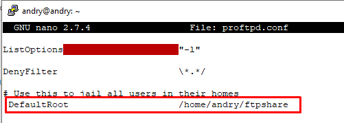 10. cari dan temukan yang namanya default root ubah dengan direktori /home/(namauser)/ftpshare. Jangan lupa hilangkan tanda pagarnya.