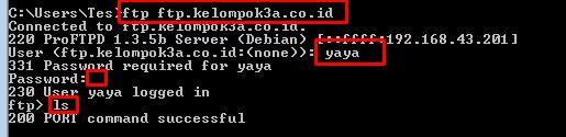 3. kemudian kita coba login ftp melalui cmd pada OS Windows 7 Client.