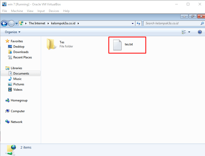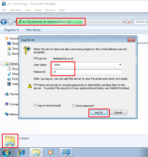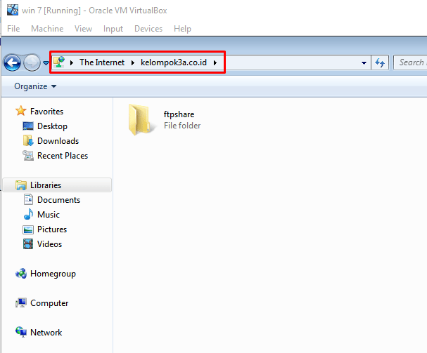 4. Tes selanjutnya, buka file explorer kemudian ketikkan ftp://kelompok3a.co.id dan ENTER