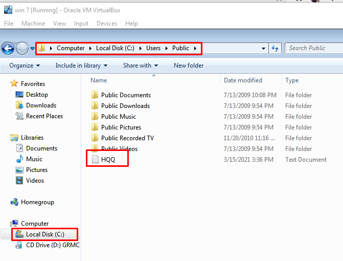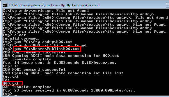 2. Jika sudah, login FTP Melalui cmd. Kemudian masukkan perintah put C:\Users\Public\HQQ.txt ( setelah kalimat put adalah lokasi penyimpanan file )