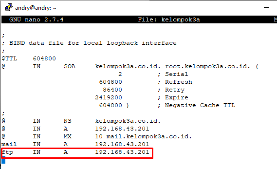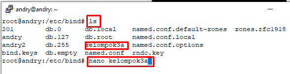2. Kemudian, Pindah ke direktori bind dan temukan file yang telah dikonfigurasi DNS sebelumnya, disini terlihat file yang akan ditambahkan layanan ftp adalah kelompok3a biila sudah edit file tersebut dengan perintah nano kelompok3a