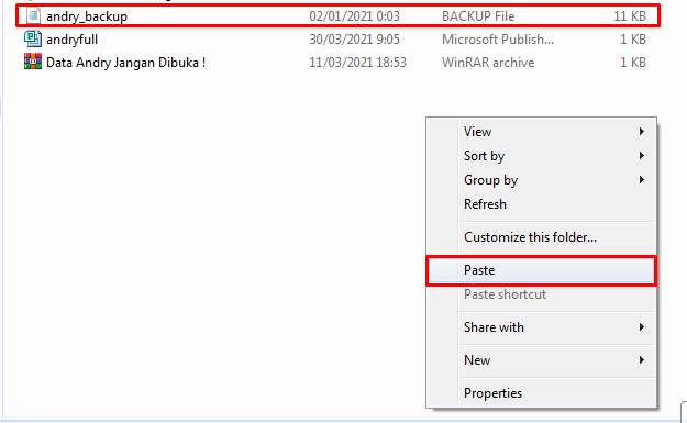 12. Kemudian, kita klik kanan & paste file backup tersebut pada hard drive / penyimpanan di laptop kita, misal saya paste di path C:Document/Tempat lain boleh ( asal penyimpanan pada PC/Laptop kalian ya bukan cloud ).