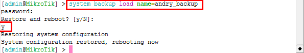15. Oke, sekarang saya coba untuk membackup/meminta file simpanan dengan nama file backup yang sebelumnya dibuat. muncul reboot cukup setuju saya / klik y. otomatis akan disconnect nanti.