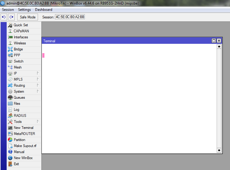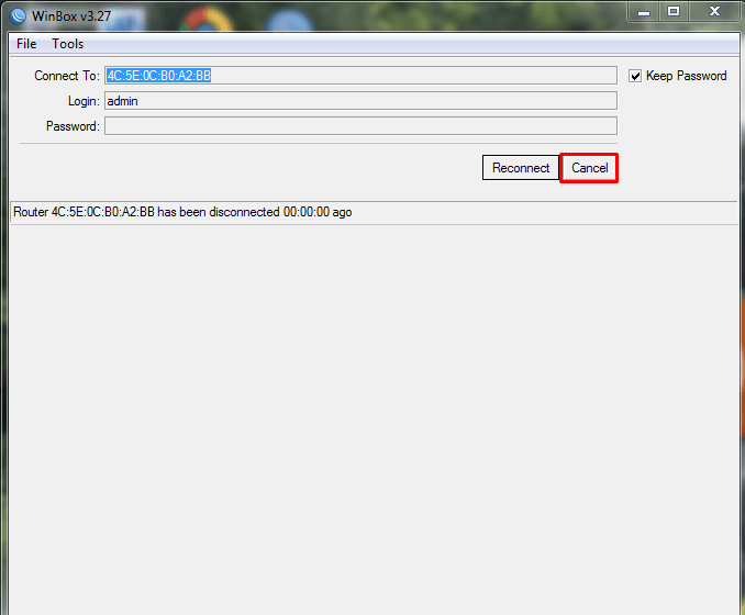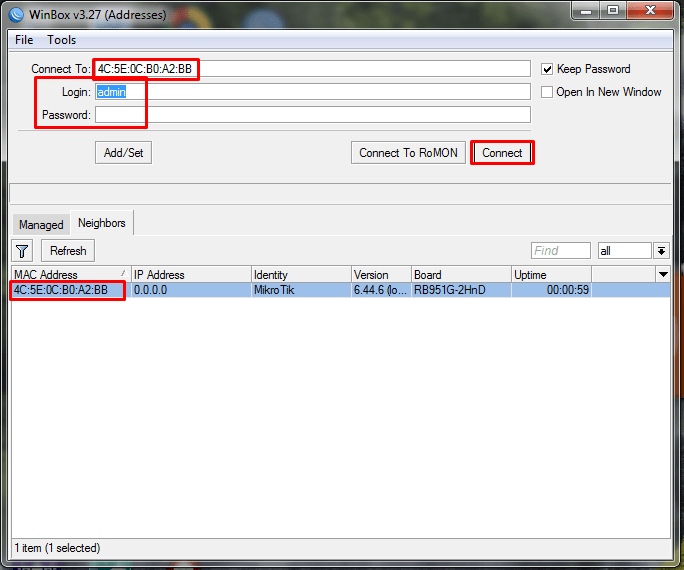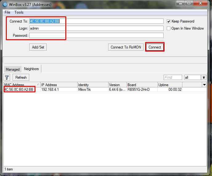 3. Login & Connect sebagai admin dan tetap menggunakan mac address.