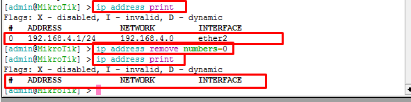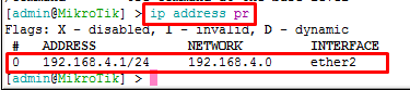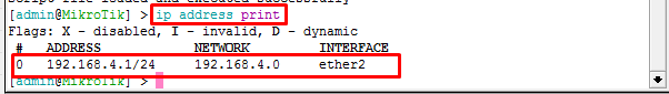 7. kita coba lihat “ip address print” dan terlihat jelas, bahwa ip address telah kembali / restore pada RB kita.
