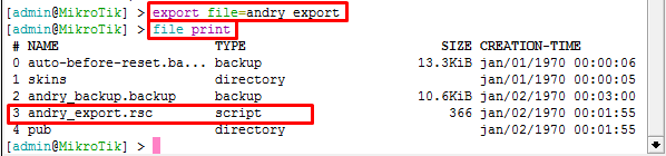 - kita buat file rsc terlebih dahulu “export file=(nama file bebas).”