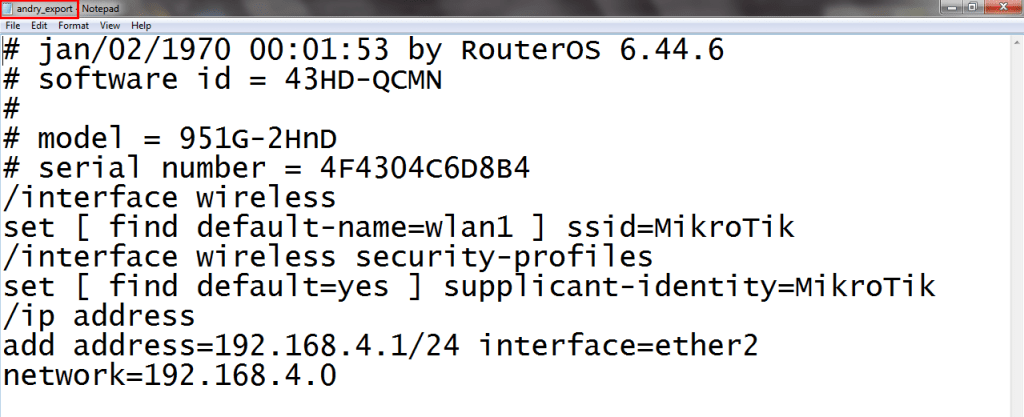4. Buka sebagai Notepad. Telihat jelas, bahwa dengan RSC kita paham dengan isi konfigurasi yang ada file berekstensi .rsc tersebut. tetapi, kelemahan metode ini, tidak dapat membackup username serta password. selain itu, metode ini juga menurut saya, kurang aman. apabila ada hacker yang mencoba meremote RB kita dengan Ip Address tersebut, apalagi menyalakan semua service pada mikrotik & menggunakan user admin/default (dari bawaan). Agak bahaya ya !