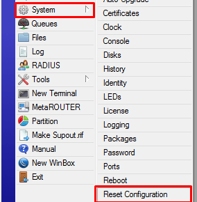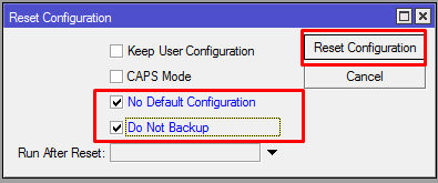 - Jika anda centang No Default, maka tidak ada diberikan konfigurasi mikrotik secara default, mikrotik akan benar-benar kosong tanpa konfigurasi bawaan.