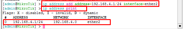 5. Selanjutnya, ketik perintah pada terminal “ip address add address=(ip address bebas) interface=(yang terhubung antara laptop dengan RB ), untuk menambah Ip Address.