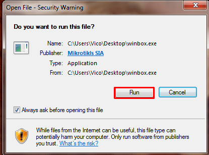 - Pertama-tama, pastikan mempunyai aplikasi winbox kemudian buka aplikasi tersebut, pastikan pula laptop/pc kalian telah terkoneksi oleh RB menggunakan setidaknya satu kabel LAN.
