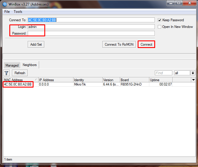 3. login dengan admin dan password ( blank/kosong ) login dengan MAC ADDRESS.