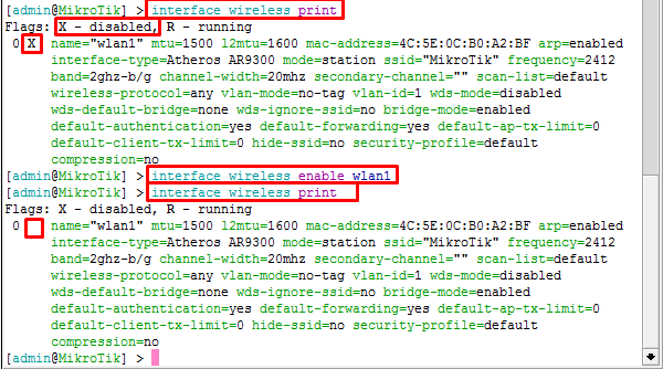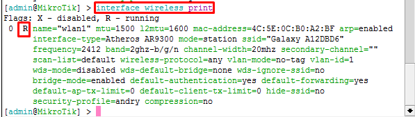 9. cek interface wireless sudah running atau belum, bila belum muncul status R maka teman-teman bisa mencoba ulang perintah “interface wireless print“.